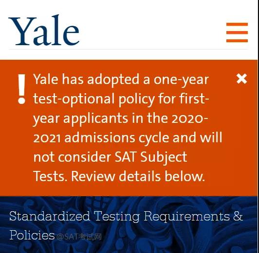 耶鲁大学官网也正式公布了2020-2021申请季的录取政策:耶鲁大学在新的申请季,对第一年申请者标准化考试成绩采取Test-Optional政策,并且不再考虑SAT科目成绩。