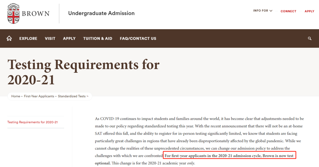对于2020年秋季申请的这一批学生,布朗大学将采取Test-Optional政策。