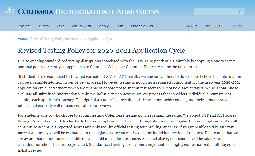 哥伦比亚大学针对2021年秋天申请的一年级本科新生采用了一年的Test-Optional政策。