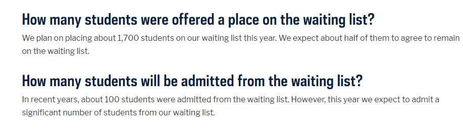 一般来说, 候补名单转正概率是极低的 。 比如上文所述的圣母大学,2018/19学年仅从1450名学生中转正了20名学生,转正率为1.38%。 很多知名院校,比如达特茅斯、范德堡、卡耐基梅隆、埃默里大学等转正率更是0%。