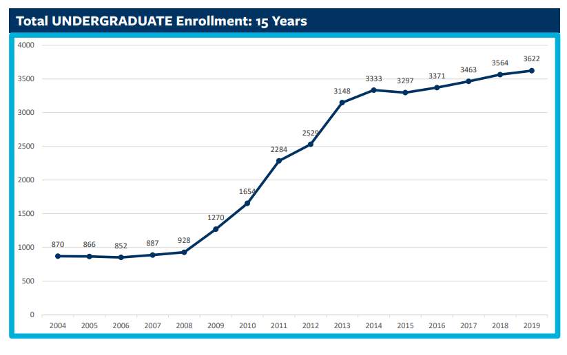 本科生的数据趋势就更明显了。从下图,我们可以看到,一直到2008年,加州大学伯克利分校的本科国际学生都只有900名左右。但从2009年到2013年,仅仅5年时间,加州伯克利的本科国际学生从900人增长到了3150人,这是整整3.5倍的增长!