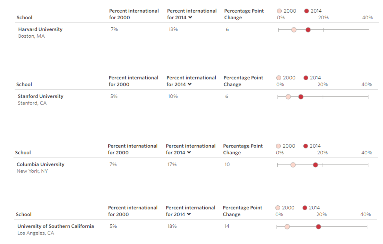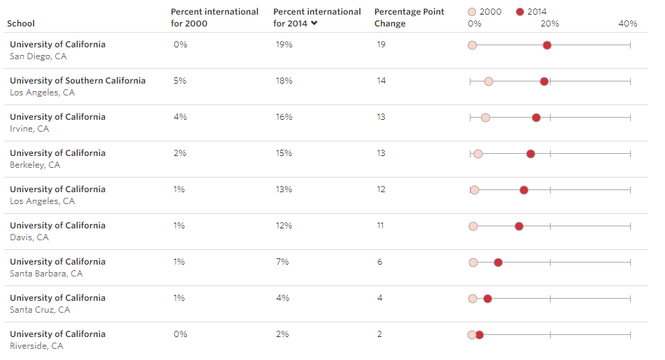 下图是在2000和2014年中,部分美国大学国际学生占整体总数比例的变化,其中哈佛、斯坦福、哥大、南加大等顶尖私立大学国际学生占比增长了至少一倍(比如哥伦比亚大学的国际学生比例从7%增长到17%)。作为美国公立大学的典范,加州大学更是从2000年普遍低于5%的国际学生占比增长到了2014年的15%以上,翻了3倍都不止。