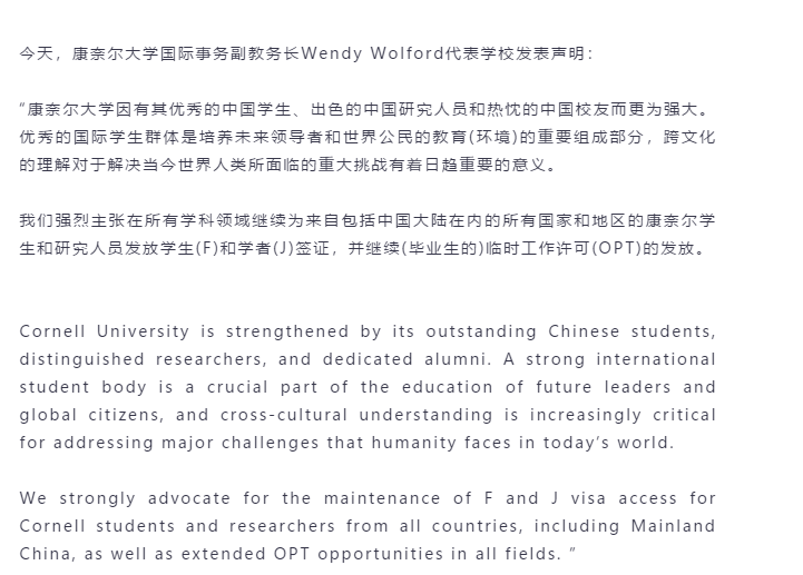譬如,康奈尔大学就在特朗普发布限制中国研究生留学申明后第一时间发表申明:“我们强烈主张在所有学科领域继续为来自包括中国大陆在内的所有国家和地区的康奈尔学生和研究人员发放学生(F)和学者(J)签证,并继续(毕业生的)临时工作许可(OPT)的发放。”