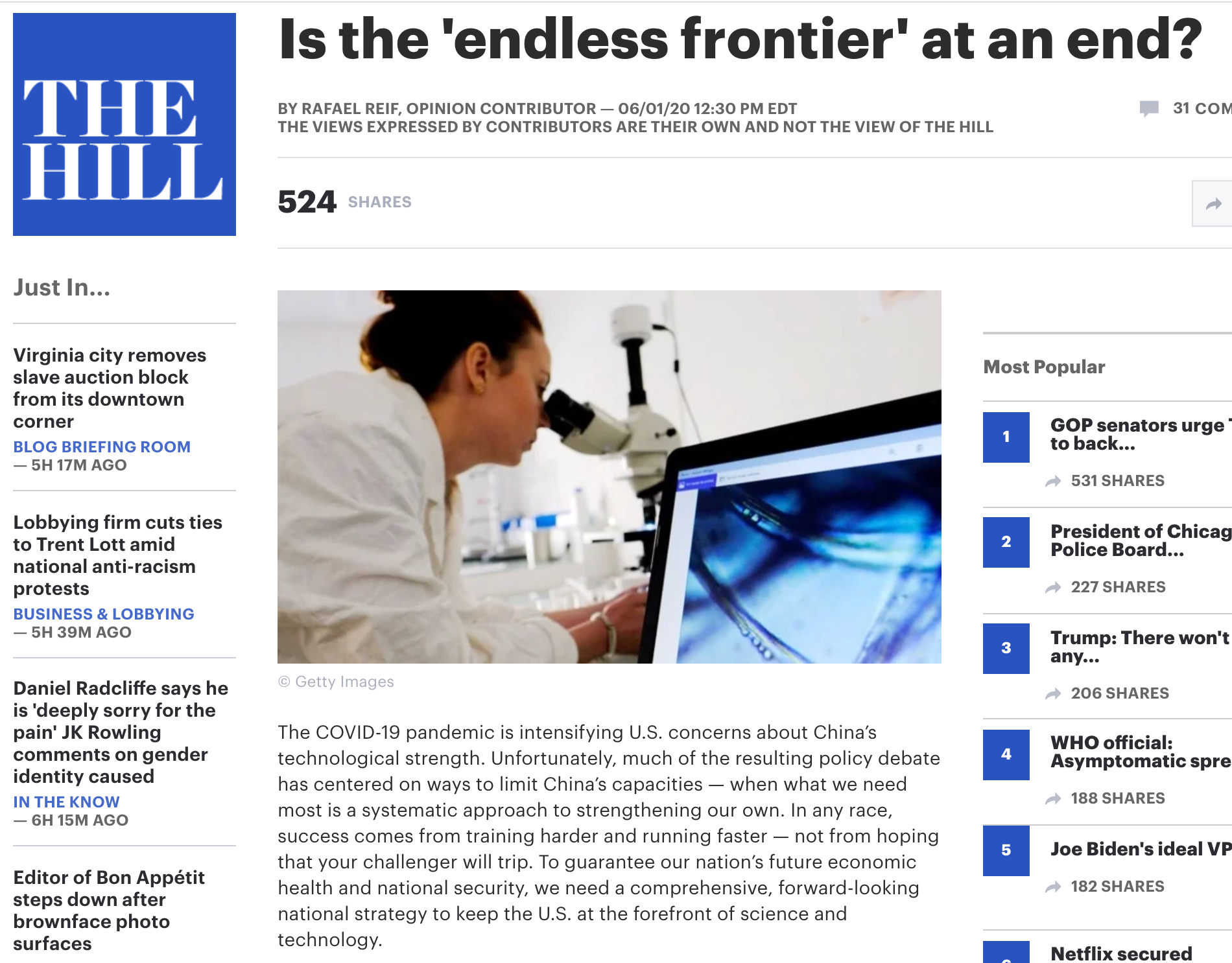 同时,MIT(私立大学)校长Reif博士也在6月1日发表的文章中称:“因为新冠疫情,我们对于中国,尤其是在科研科技上是忧心忡忡的。但我们的解决方式不是增强自己本国的科研能力,而变成了出台一系列限制中国科研的政策,这是更令人担忧的。在任何比赛中,所有的成功都是自己通过努力训练变得更快、更强,而不是寄托于对手的失败。”