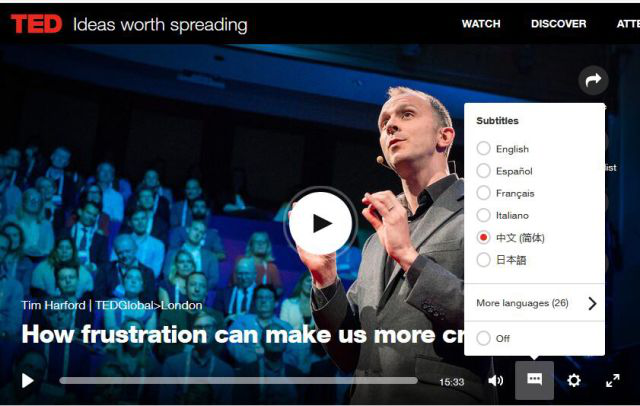 神奇的是,每个 TED演讲都有 26种语言 的字幕可以选择,就在视频 右下角 ,超级方便!但是练习英文听力的小伙伴还是把字幕取消掉吧 !