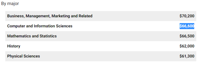 PayScal数据显示,埃默里大学本科毕业生的起薪为$59,200,商科专业毕业生工资最高,为$70,200;其次是计算机科学毕业生,年薪为$66,600,其他高薪专业如下: