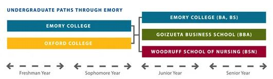 两年后,学生可以决定继续在主校区获得学士学位,或者是向Goizueta商学院申请BBA学位,或继续向内尔&miot;霍奇森伍德拉夫护理学院申请BSN学位。具体如下图: