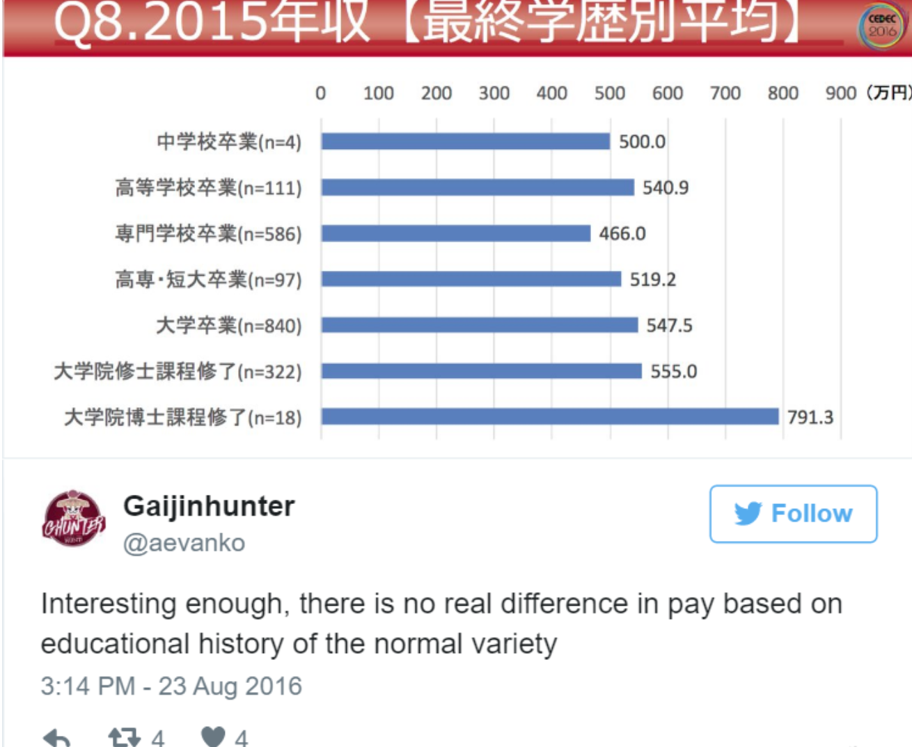 AEvanko表示受教育水平对工资的影响并不大。高中水平从业员的平均年薪为5.4万美元,大学生则是5.47万。制作人(Proucer)的平均职业寿命为12.1年,总监(Director)的工资远远低于西方水平。同时策划工作面临高强度的工作压力,只有不到一半的策划从业人员结婚生子。