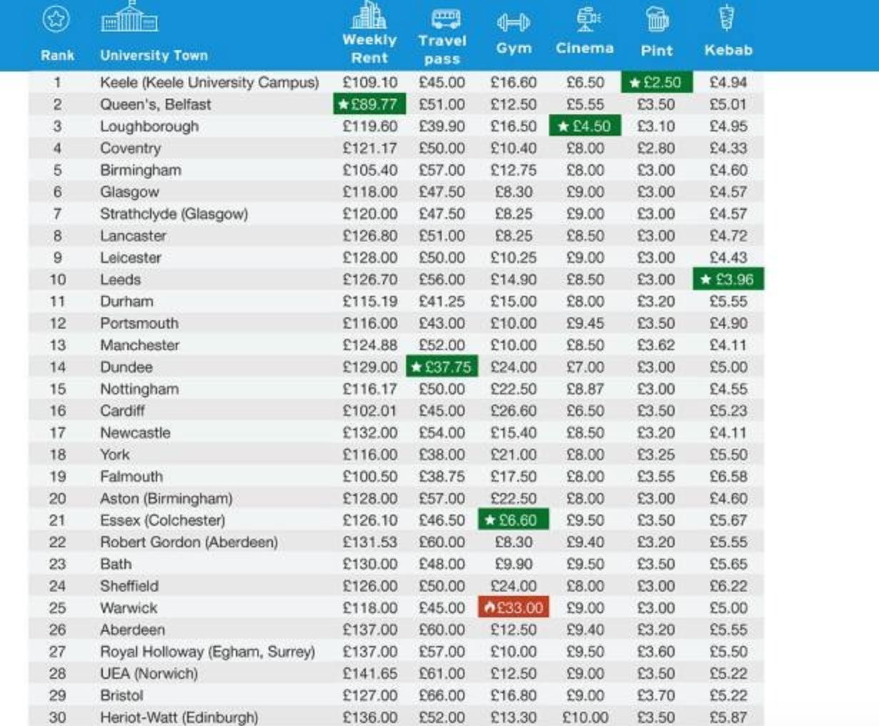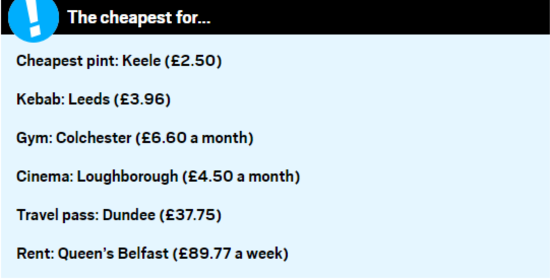 去英国留学,除了租房﹙当然,你也可以选择住在校内﹚,还有一些社交活动什么的,都是需要胖子。综合了英国大学学生每周租房,旅行,喝酒,烤肉串,电影等费用,选出来几个物价极低的大学,小伙伴做个选校参考。