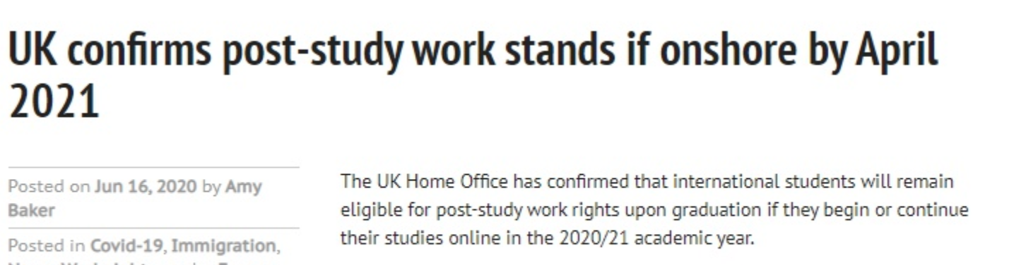 内政部在白皮书中确认,2020/2021届入学的国际学生无论在境外或境内开始线上课程,只要在2021年4月6日前入境英国并符合条件,均都有资格申请psw签证,即毕业后可获得长达2年的工作签。,进一步给予国际留学生远程线上或线下结合授课的认可和信心。