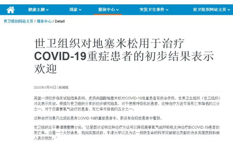 对此,世卫组织总干事谭德塞向英国政府和牛津大学表达了祝贺,表示这是首个已证明的可降低中度和重症患者死亡率的治疗方法。