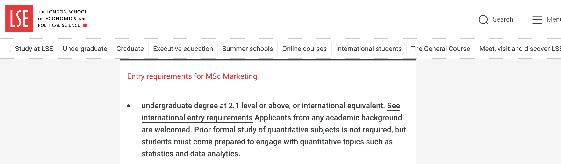 以LSE为例,LSE在官网上对于MSc Marketing的Entry Requirement 明确表示,欢迎任何专业背景的学生申请(Applicants from any acaemic backgroun are welcome)。