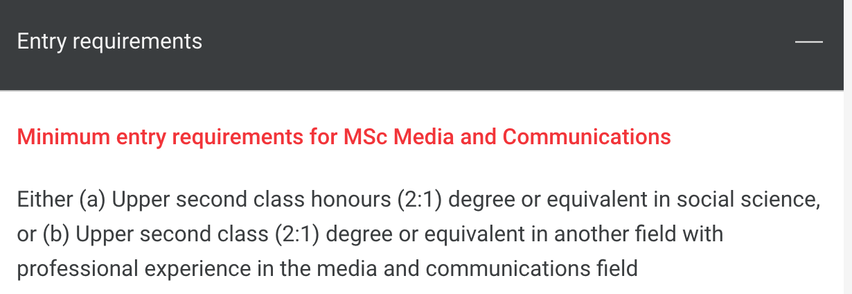 比如下图是LSE对于Meia an Communications专业的入学标准,其中表示,接受任何社会科学类专业在读学生申请,同时,对于非社科类专业学生,只要有传媒相关的实习经历也是可以申请的。