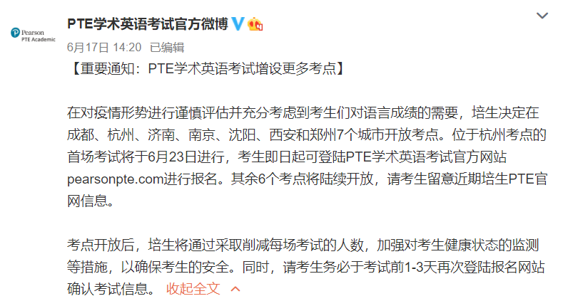 在对疫情形势进行谨慎评估并充分考虑到考生们需要语言成绩以获取海外院校录取通知书的迫切需求后,培生决定在成都、杭州、济南、南京、沈阳、西安和郑州7个城市开放考点。位于杭州考点的首场考试将于6月23日进行,考生即日起可登陆pte学术英语考试官方网站pearsonpte.com进行报名。其余6个考点将陆续开放,请考生密切关注培生官方信息。