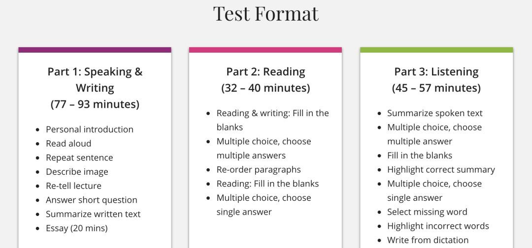 1)口语与写作:考试时间平均为77-93分钟,包括大声朗读,重复句子,描述图像,复述文章,回
