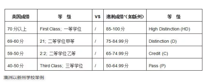 首先我们来看一下英国和澳大利亚的学位等级评分标准对比表: