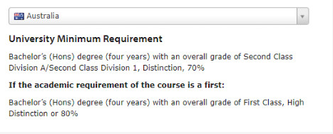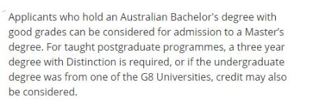 硕士课程要求澳洲四年制学位或者荣誉学位申请者拥有2.1,DivisionA,Division1或者大部分科目成绩B+,而对于三年制本科学位申请者,则要拥有Firstclass或者HD且大部分科目成绩A。