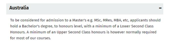 英国学校对于澳洲四年制的要求跟英国本科学位的要求基本一致,一般需要二等学位以上,即2:1或2:2学位,如果要申请英国Top20的院校大部分硕士要求2:1学位。