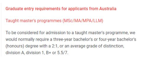 LSE接受澳洲三年制或四年制(荣誉学位)本科,要求澳洲学位的申请者持有2:1学位或均分达到istinction, ivision A, ivision 1, B+ 或5.5/7。