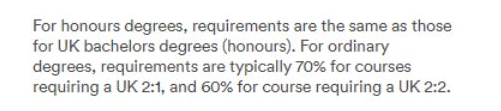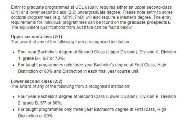 UCL硕士申请要求2:1学位的专业,澳洲四年制学位申请者需要达到Secon Class(Upper Division), ivision A, ivision 1, B+, 6/7或70%;三年制本科要求达到 First Class, HD或每学期分数达到80%。