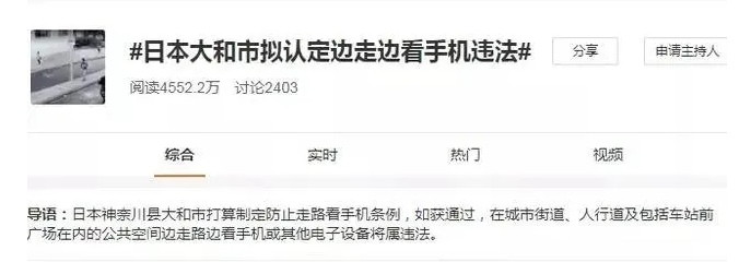 这条议案如果通过,这将成为日本首例防止走路看手机条例。以后在城市街道、人行道及包括车站前广场在内的公共空间,一边走路一边看手机或其他电子设备将属违法。国内的小伙伴看到不禁感叹:还好不在日本!是啊,以中国的手机用户数量,和用手机的习惯来看,如果走在路上玩手机犯法,估计政府都要忙不过来了。