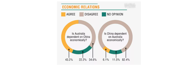 相比之下,2019年Lowy的年度民意调查显示,74%的澳大利亚受访者同意“澳大利亚在经济上过于依赖中国”的说法,而24%的人不同意。