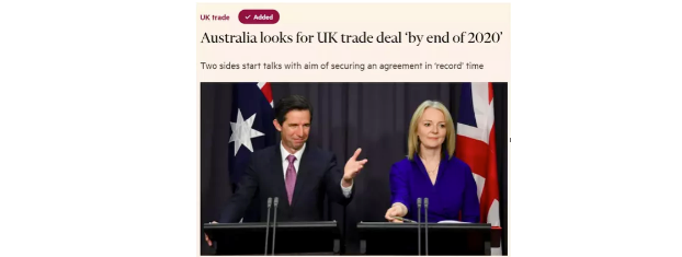 “英国和澳大利亚拥有全世界难得的伙伴关系,现在英国成功脱欧,我们终于有机会把我们共同的历史和紧密的友谊转换为一份全球领先的自贸协议。”