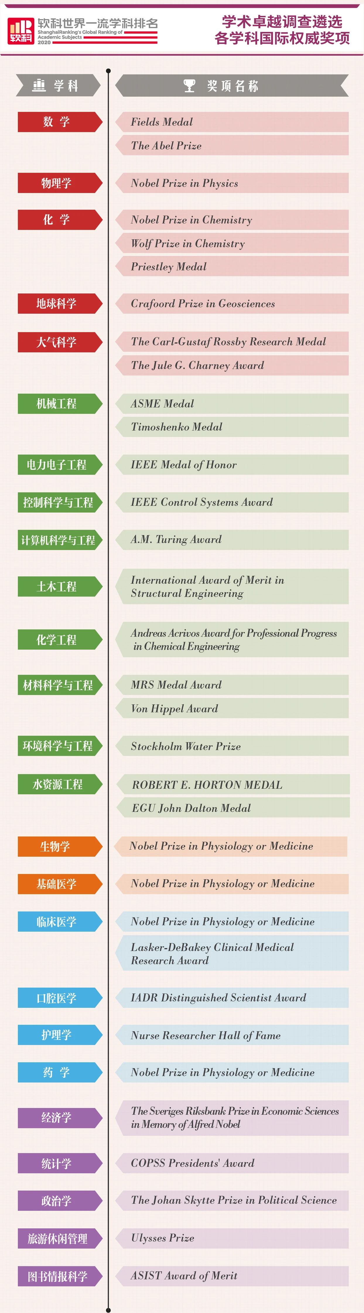 排名的指标主要有: 重要期刊论文数、论文标准化影响力、国际合作论文比例、顶尖期刊论文数、教师获权威奖项数。 其中参考的权威奖项主要有如下这些。同学们可以关注下自己感兴趣的专业领域有哪些奖项噢。