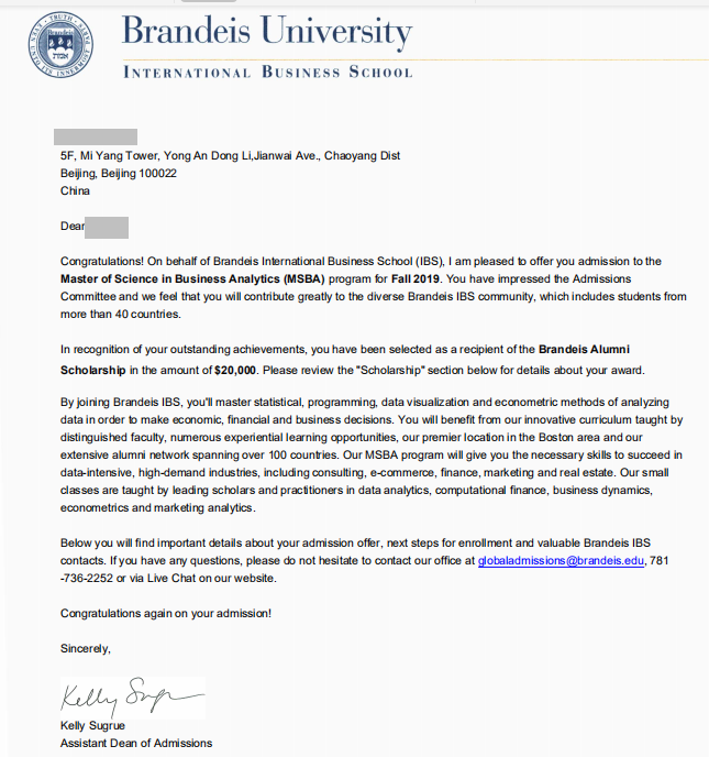 学生为本科转学学生,在布兰迪斯读经济学,并双专业了数学专业。在校期间,GPA非常高,而且多次获得ean’s list。学生在申请前期,并不明确想要申请的专业,考虑过Finance,BA以及Accounting 3个方向,最后决定主要申请BA。分析学生背景后,学生数学基础比较强,GPA高,但是相关实习经验以及计算机能力略微薄弱。