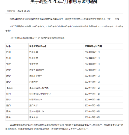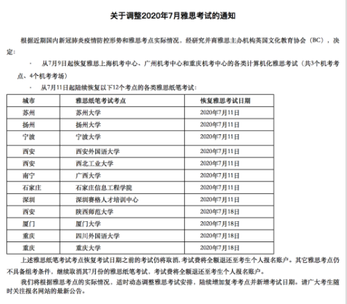 除此之外,上述雅思纸笔考试考点恢复考试日期之前的考试仍将取消, 考试费将全额退还至考生个人报名账户。其它雅思考点仍不具备组考条件,继续取消其7月份的雅思纸笔考试,考试费将全额退还至考生个人报名账户。