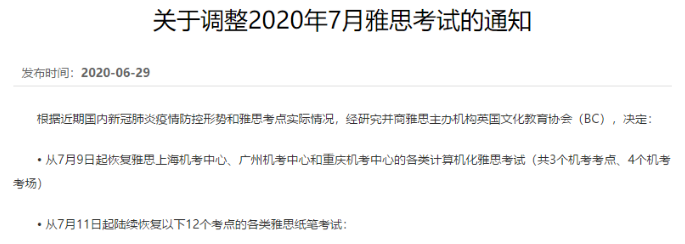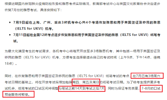 官方明确说明考试恢复后会新增大量考位满足大家的需求,在已有基础上,增加包括周四、周五、周日的纸考。口语区间调整到笔试之前14天到考试之后7天,7-8月口语预定服务暂停。