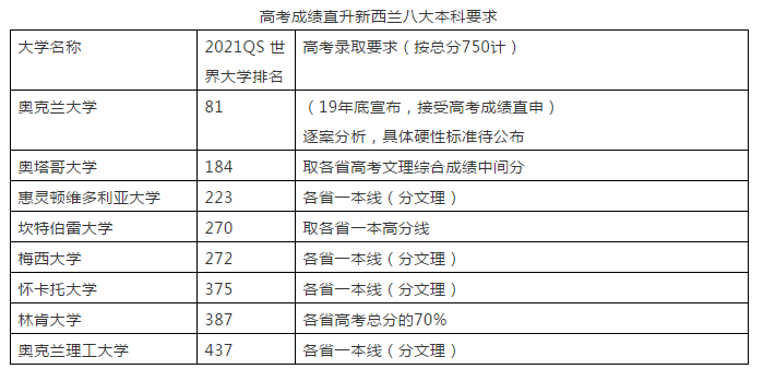 新西兰的八所公立大学,全部接受中国高考成绩申请大学本科课程。新西兰成为了在中国之外,全球第一个所有公立大学均认可高考成绩的国家。只要你的高考成绩和语言成绩符合一定的要求,你就有机会凭高考成绩申请新西兰的8所大学!