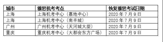 * 7月9日起在上海、广州、重庆3所机考中心共4个考场恢复雅思和用于英国签证及移民的雅思(ielts for ukvi)机考。
