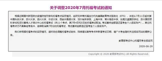 根据教育部当前针对新型冠状病毒感染肺炎疫情防控的相关要求,其它考点暂不具备组考条件,ets与教育部考试中心决定自即日起取消这些考点7月份的所有托福ibt考试和gre?普通考试。考生在上述名单以外的考点注册的7月份考试将自动取消,考试费用将全额退还至考生的neea个人账户,以便考生重新安排后续日期的考试。