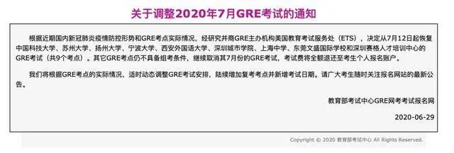 鉴于部分国内gre考点已具备恢复考试的条件,美国教育考试服务中心(ets)与教育部考试中心(neea)共同商讨决定从7月12日起恢复以下考点的gre?普通考试: