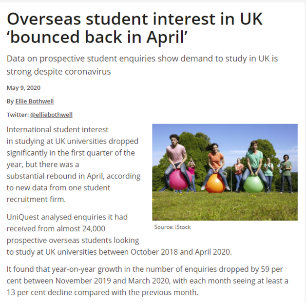 前段时间,《泰晤士高等教育》发布教育机构UniQuest的最新调查,根据其调查数据显示:虽然根据数据显示今年第一季度准国际生对英国大学学习意向大幅下降,但2020年4月全球准国际生对英国的意向度大幅提升,和2019年4月份相比暴增67%!