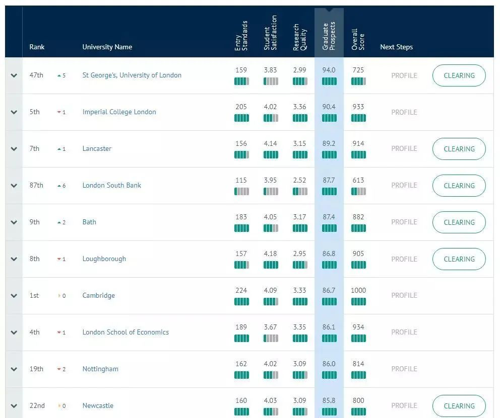 6-10的排名依次为:巴斯大学,兰卡斯特大学,帝国理工大学,华威大学,埃克赛特大学。