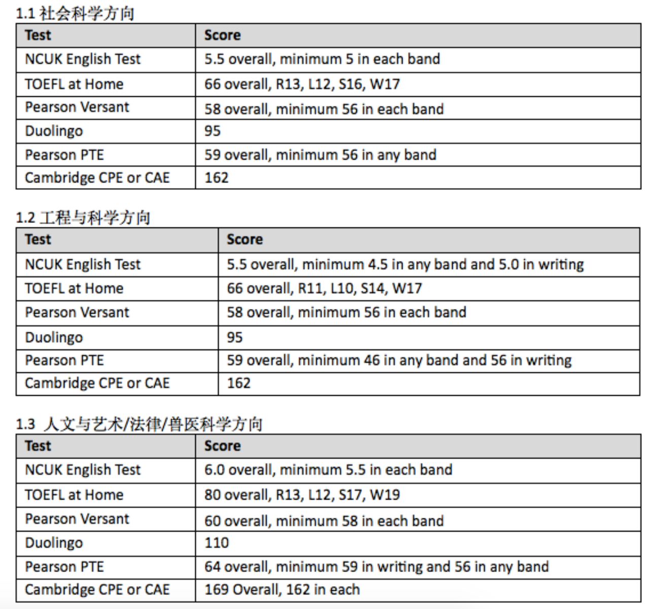 非工程类专业 高考总分的50%, 雅思或同等水平6.0(5.5)