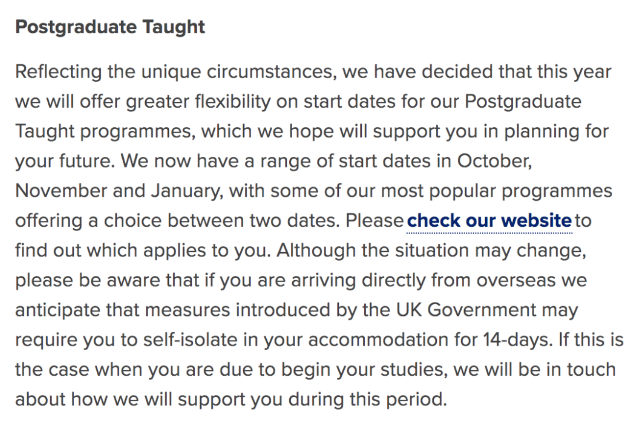 利兹大学 利兹大学的大部分研究生专业改成了2021年1月开课,有一部分专业依旧9月开学,还有一部分专业可提供2020年9月以及2021年1月开学的选择。 这周内,学校就会给各offer holer发邮件通知相关事宜,因此,申请利兹大学的同学们记得经常查看自己的邮箱。
