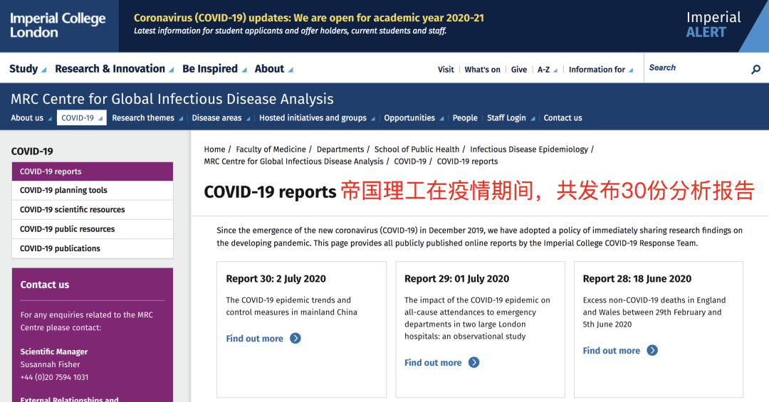 帝国理工可以说是为这次英国抗疫贡献最大的学校。因为是在帝国理工的建议下,英政府才开始考虑实施「全民封锁」措施,并开始重视英国疫情的严重性。从1月份新冠病毒在国内初步爆发的时候,帝国理工就开始跟踪分析数据,1月17日至7月2日五个多月的时间里,产出了30份报告。从分析武汉的疫情爆发受到质疑,到分析全球疫情病死率被世卫组织采纳,再到后来建造英国疫情分析模型,以警示英政府立即采取行动,可谓功不可没。7月2日最新发布的报告,分析了中国大陆的新冠疫情发展趋势以及控制措施。