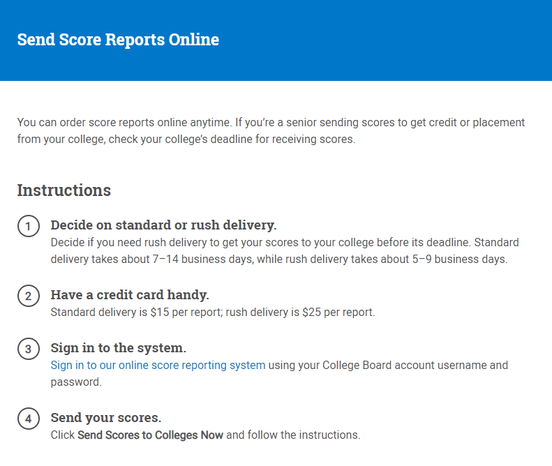 使用你的College Boar帐户用户名和密码登录CB的在线成绩报告系统,单击“立即向学院发送分数”并按照提示进行操作。