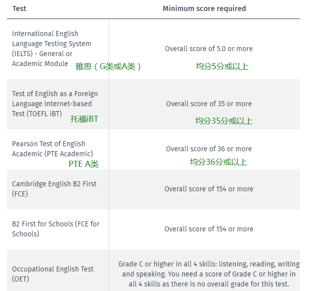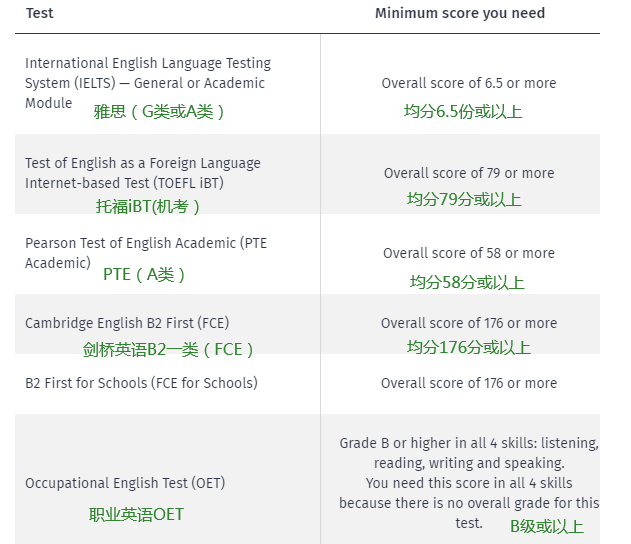 查看以下表格,找出我们接受的英语语言测试结果: