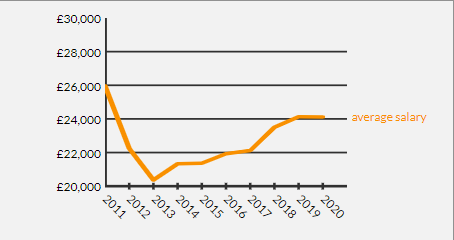 据调查数据显示,2011-2020 年英国毕业生的平均起薪为每年 £21,000-£26,000(约为人民币 19 万-23 万)。