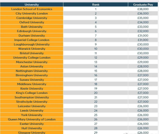 由下列榜单可见,伦敦政治经济学院(LSE)的毕业生薪酬以38000 英镑/年(年薪中位数)排在首位,是排名最低的高校(卡迪夫城市大学,18000 英镑/年)的两倍多。