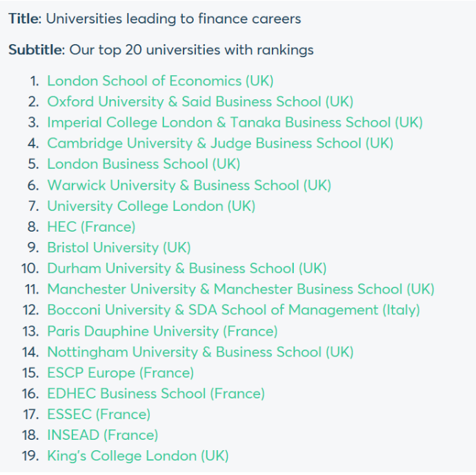 此外,Emolument 还公布了一份在金融行业领先的欧洲商学院名单。这些院校的毕业生更容易进入金融行业,或在金融业获得高薪职位。可以看到,英国大学的商学院在该榜单占据绝对优势。在榜单 Top 10 占了 9 个席位,榜单前五名分别是:伦敦政治经济学院、牛津大学赛德商学院、帝国理工商学院、剑桥大学贾奇商学院、伦敦商学院。
