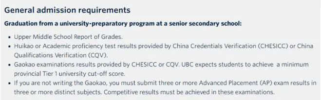 要求普高生提供会考通过证明和高考成绩,且必须经过学信网认证。所以 UBC对于高考成绩的要求是:必须提供,而且明确规定高考成绩必须达到一本线以上。 同样,如果不参加高考,需要提供书面说明,另外UBC明确规定需要提供至少三门不同课程的AP成绩,并且指出要取得高分。