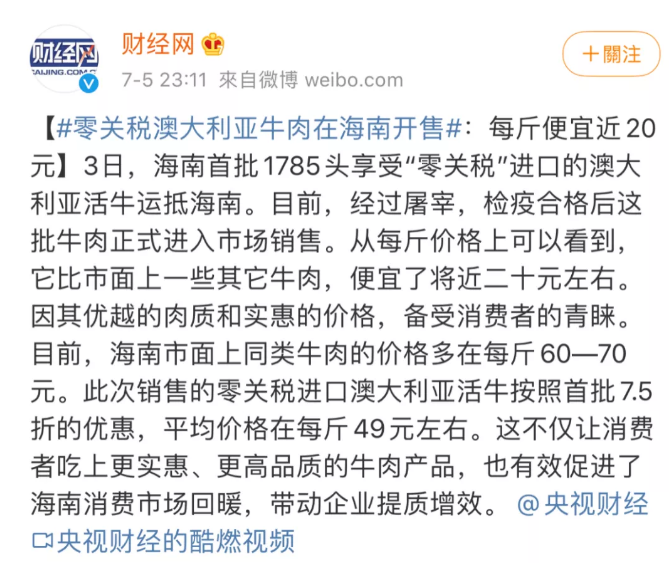 1.零关税澳牛在海南销售