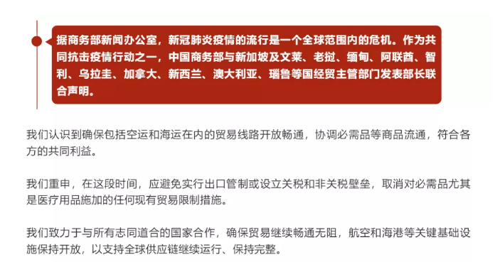 声明指出,由于新冠疫情的流行是一个全球范围内的危机。作为共同抗击疫情行动之一,商务部将致力于与志同道合的国家合作,确保贸易继续畅通无阻,保持开放。