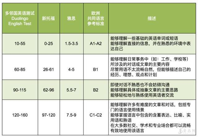 先附上托福、雅思与多邻国的分数段对比图: