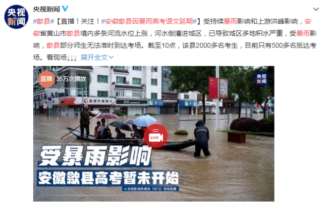 而今年的高考也注定是一场不平凡的高考。昨日,安徽歙县因暴雨高考语文延期,受暴雨影响,歙县部分师生无法准时到达考场。上午语文考试取消,下午数学考试正常进行。相关部门也表示高考尚未开始,考试时间或有调整。
